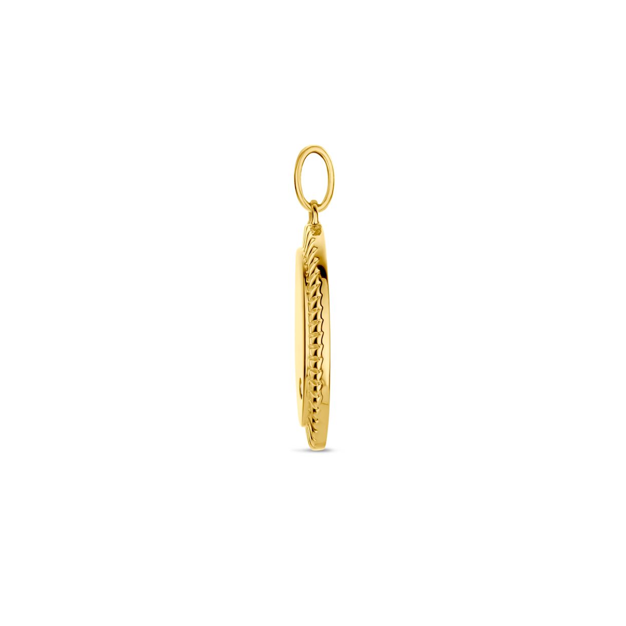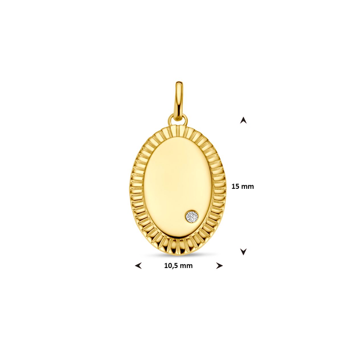 14k Geelgouden graveerhanger uitgevoerd met diamant. De hanger heeft een totale hoogte van 20mm. Het diamantgewicht is 0.01ct.