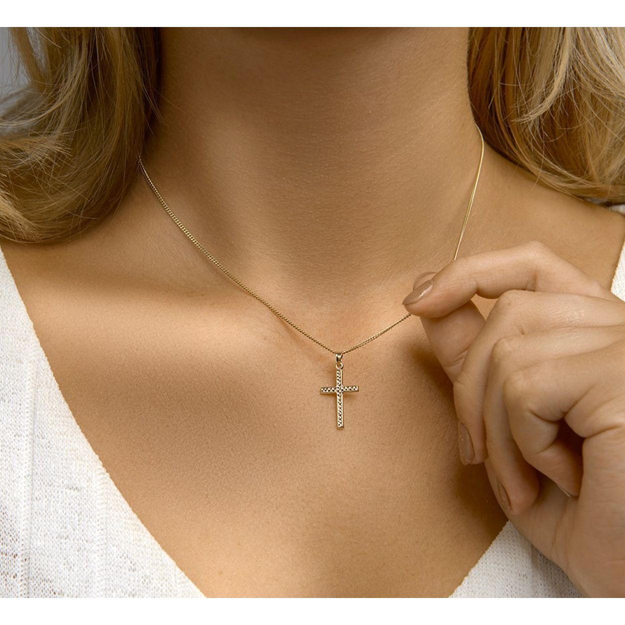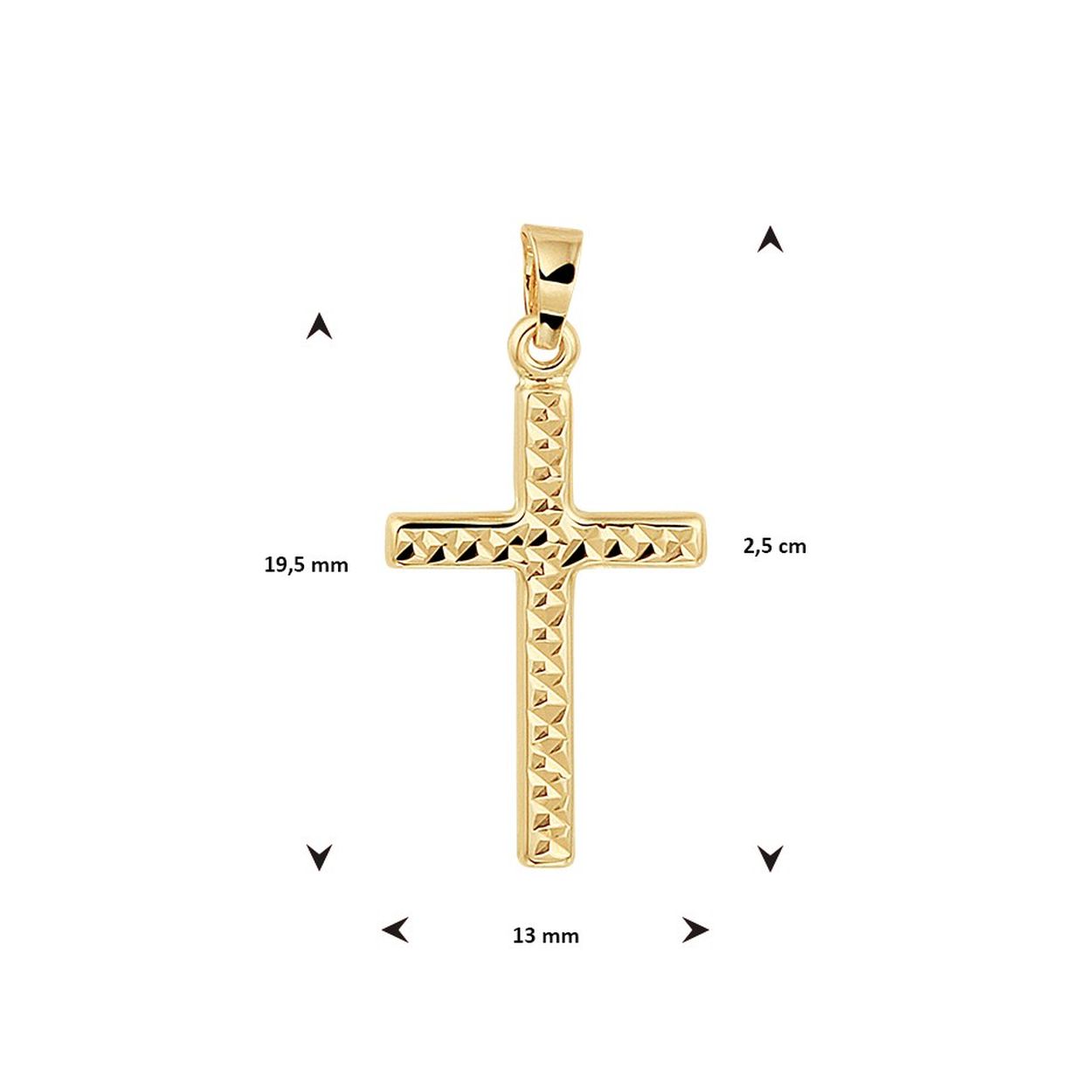 14k Geelgouden hanger uitgevoerd in de vorm van een kruis en met een gediamanteerde afwerking. De hanger heeft een totale hoogte van 2.5cm en een breedte van 13mm.
