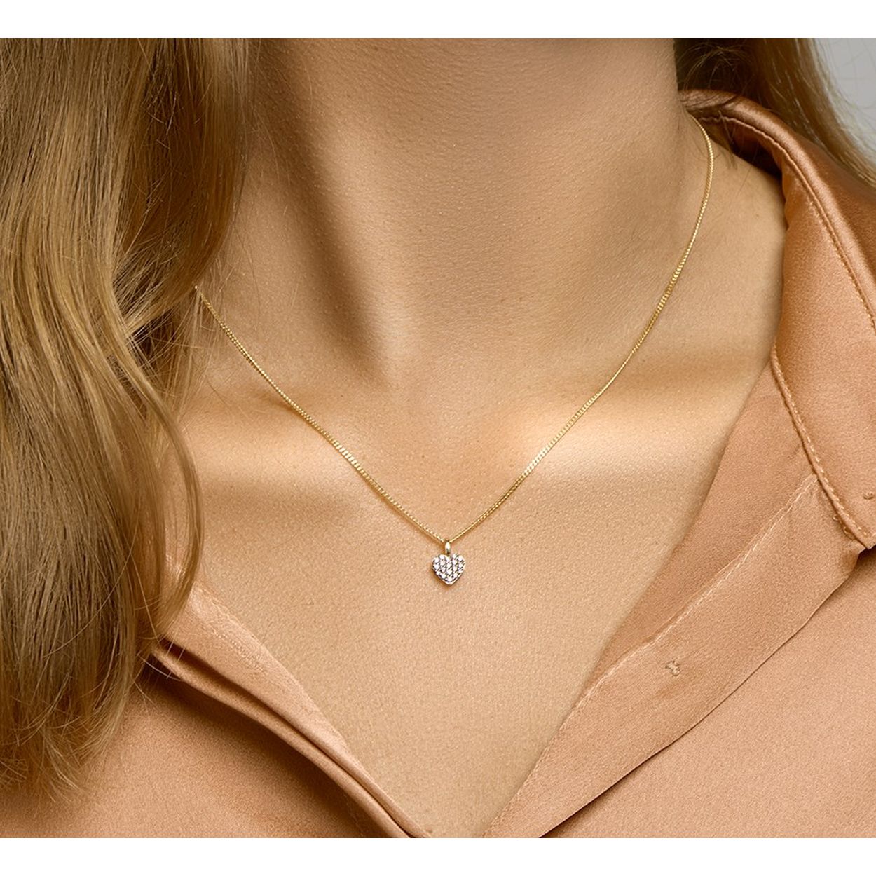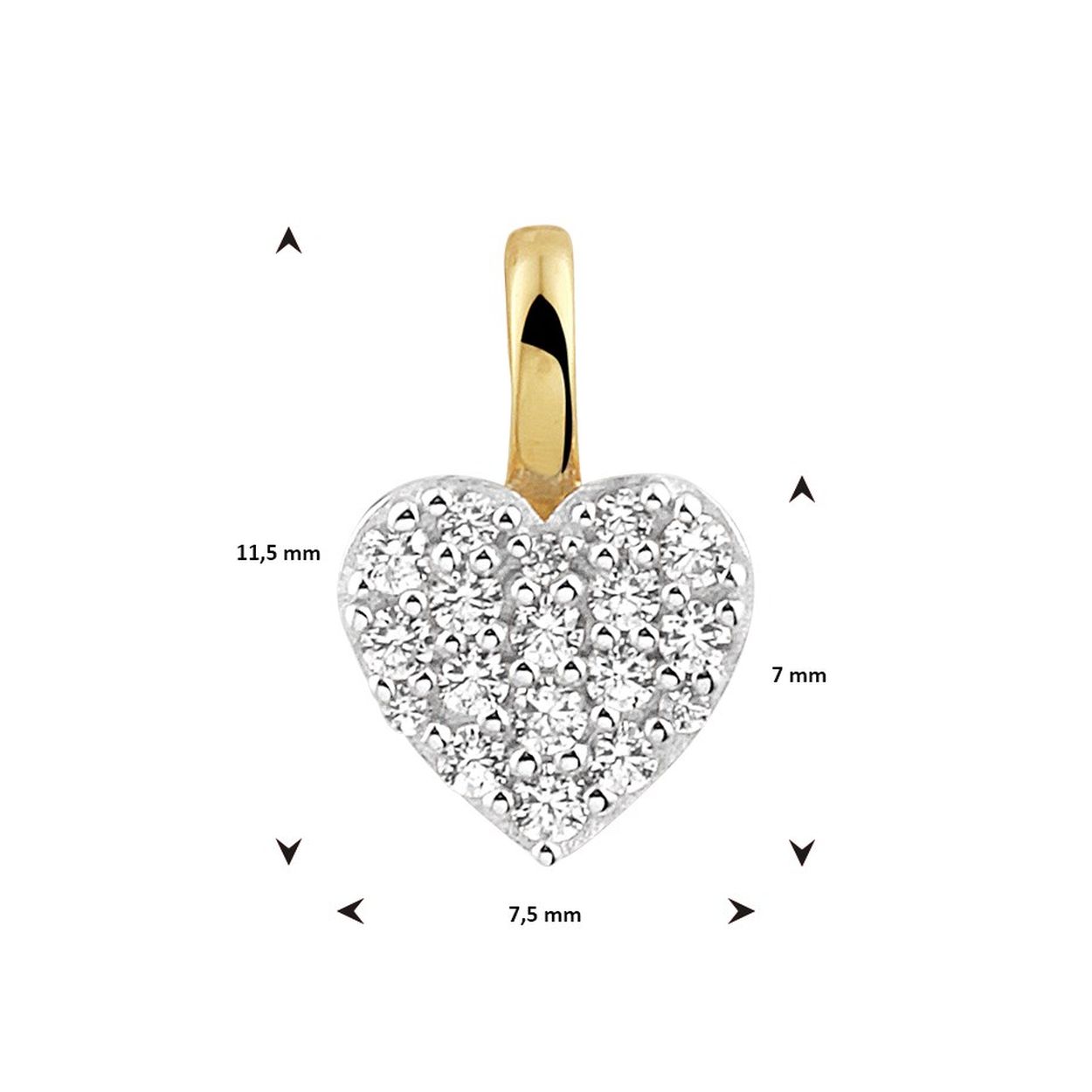 Bicolor geel- en witgoud gestifte hanger in de vorm van een hartje en uitgevoerd met een schitterend zirkonia vlak. De hanger heeft een totale hoogte van 11.5mm en een breedte van 7.5mm.