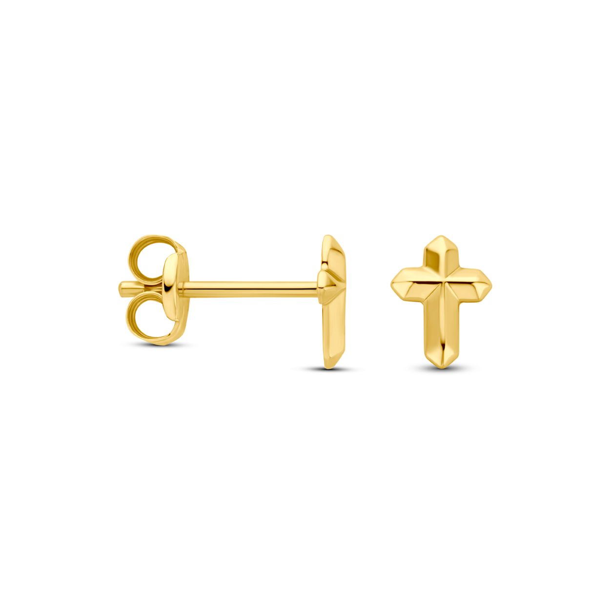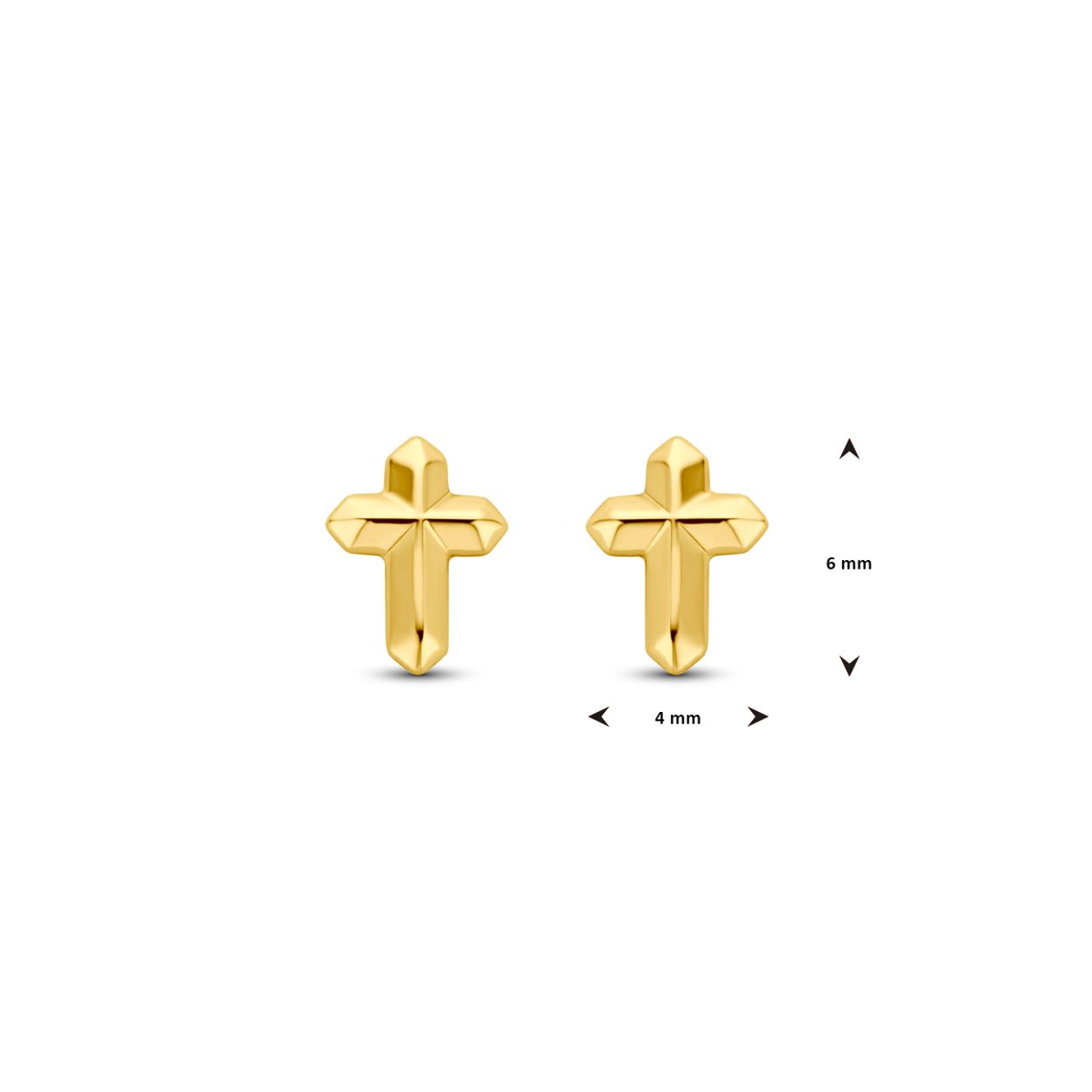 14k Geelgouden oorknoppen uitgevoerd in de vorm van een kruis. De oorknoppen hebben een afmeting van 6x4.5mm.