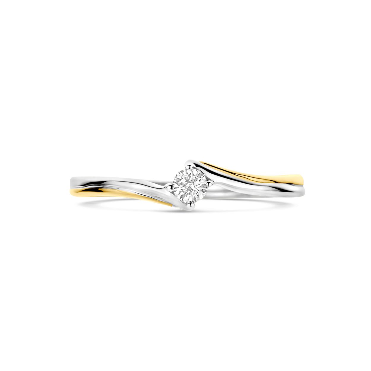 14k Geel en witgouden ring uitgevoerd met diamant. De ring heeft een breedte van 4.5mm en het diamantgewicht is 0.10ct.