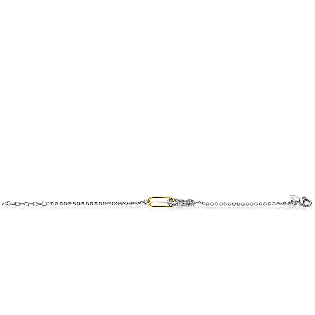 ZINZI zilveren schakelarmband met twee mooi verbonden ovale schakels: een gladde ovaal in gold plated en een ovaal bezet met witte zirkonia's. Gemakkelijk verstelbaar door het verlengkettinkje 17-20 cm. Vervaardigd van eerste gehalte zilver (925) en voorzien van een extra rodiumlaag voor een langdurige glans.